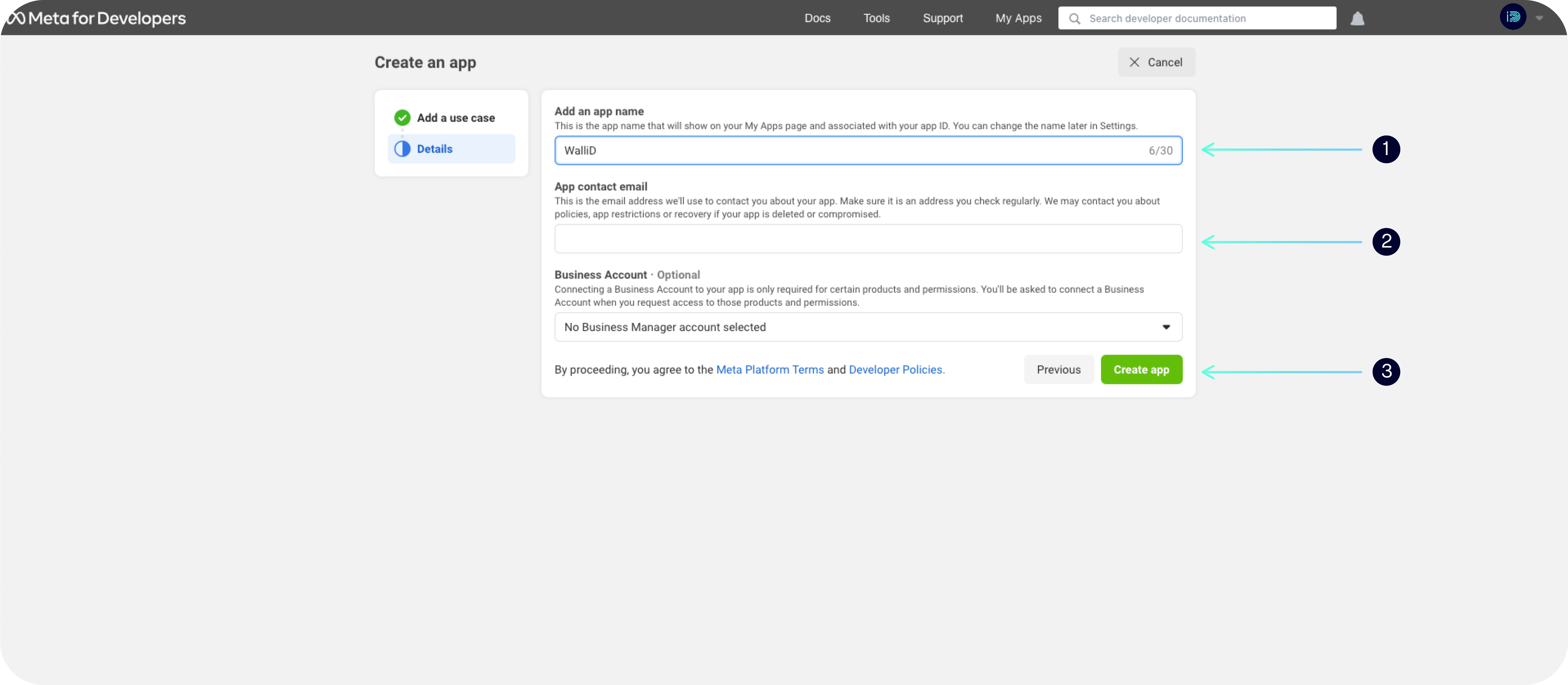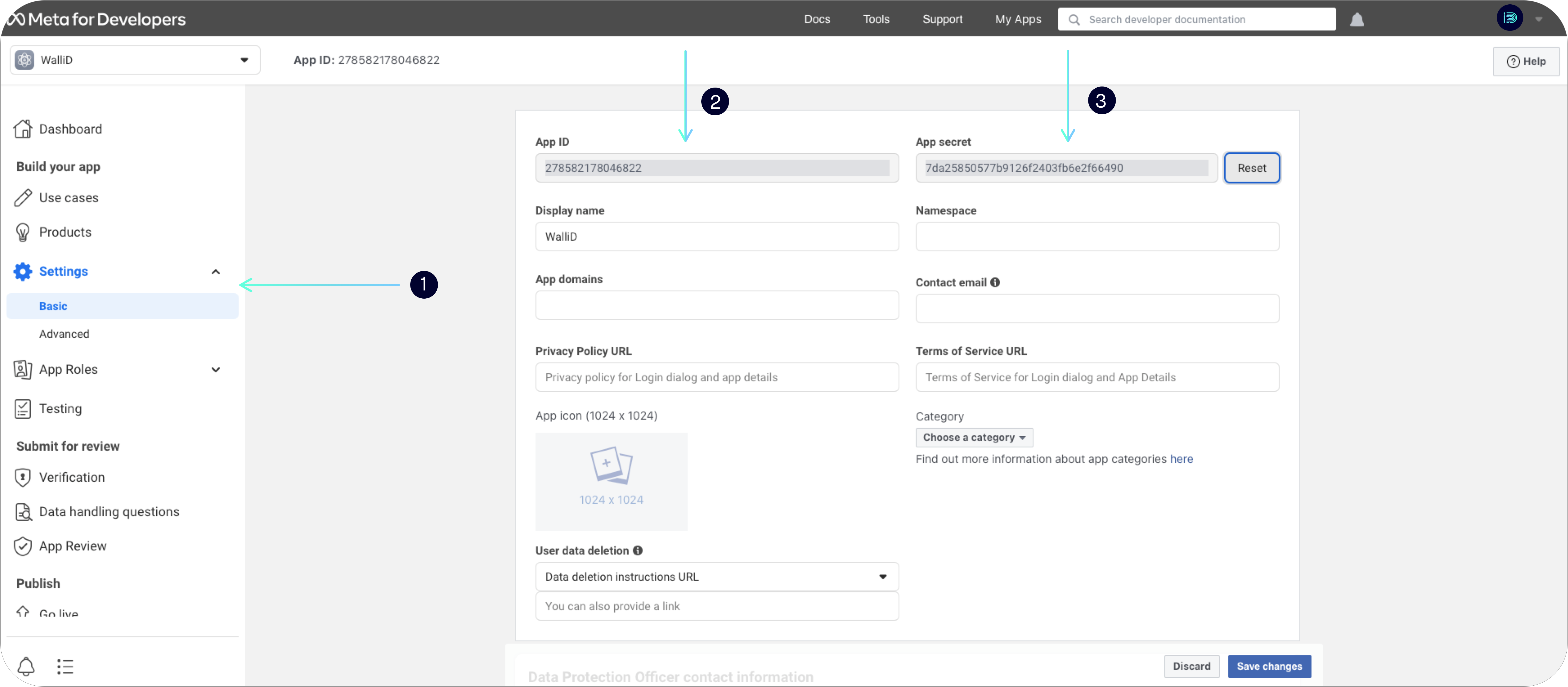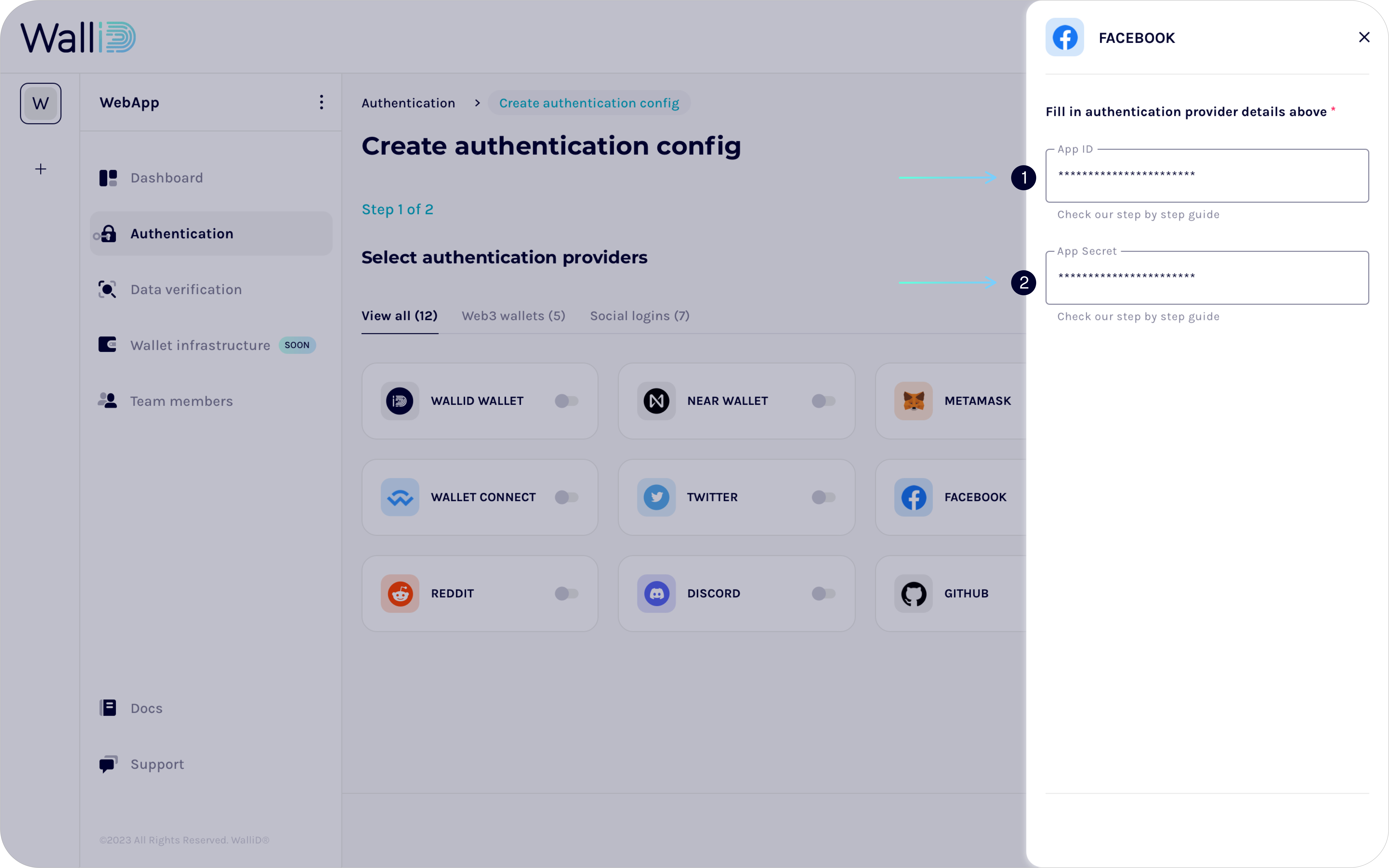 7. Paste your <mark style="color:purple;">**`App ID`**</mark> and <mark style="color:purple;">**`App Secret`**</mark> into the **corresponding fields in the WalliD config Dashboard**